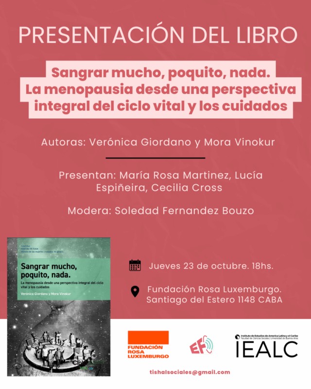 Queremos invitarles a la presentación del libro Sangrar mucho, poquito, nada. La menopausia desde una perspectiva integral del ciclo vital y los cuidados escrito por Verónica Giordano y Mora Vinokur y publicado en la Colección Puntos de Fuga. Historia de las mujeres y estudios de género del Grupo Editor Universitario.
